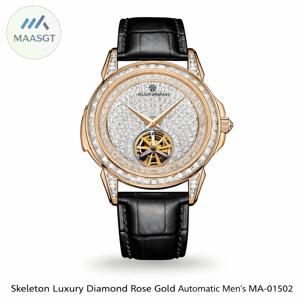 Automatic men’s watch MA1502 crafted with a stainless steel case, zircon-inlaid outer ring, sapphire crystal glass, and premium bamboo-grain cowhide leather strap. Features a precise automatic movement, elegant open-heart dial design, 42.5 mm case size, folding buckle, and 3 ATM water resistance designed for refined luxury and everyday sophistication.