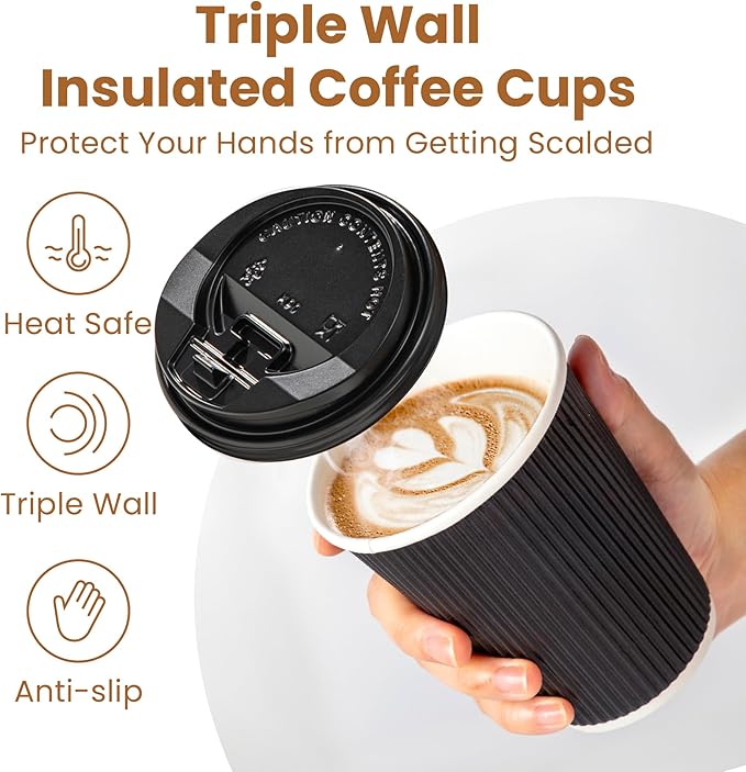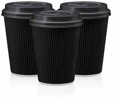 Serve hot beverages safely with these 12 oz black triple wall ripple paper cups with lids. Designed for coffee, tea, and soups, they offer excellent insulation, a secure grip, and an eco-friendly, leak-resistant design ideal for cafés and takeaway use.