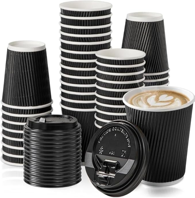 Set of 50 Black Triple Wall Ripple Paper Coffee Cups with Lids – 12 oz Hot Drink Cups