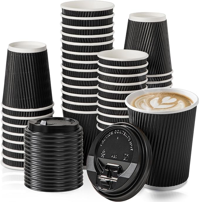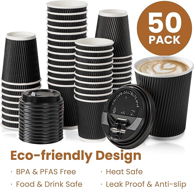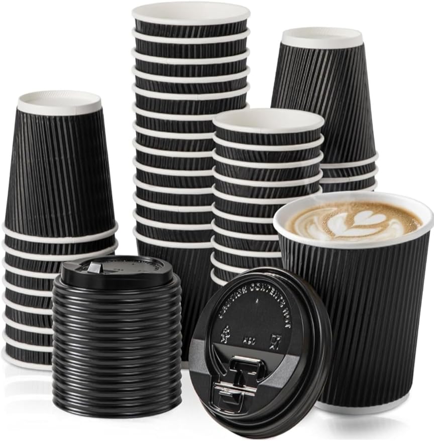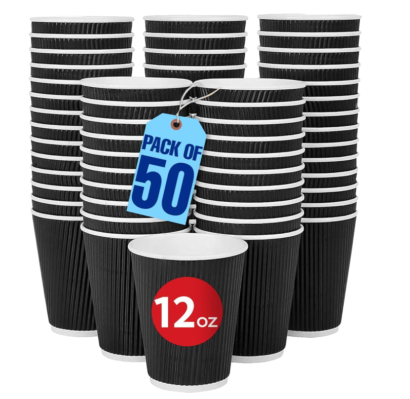 - Package includes 50 pack of black disposable coffee cups with lids; each cup holds up to 12 fluid ounces