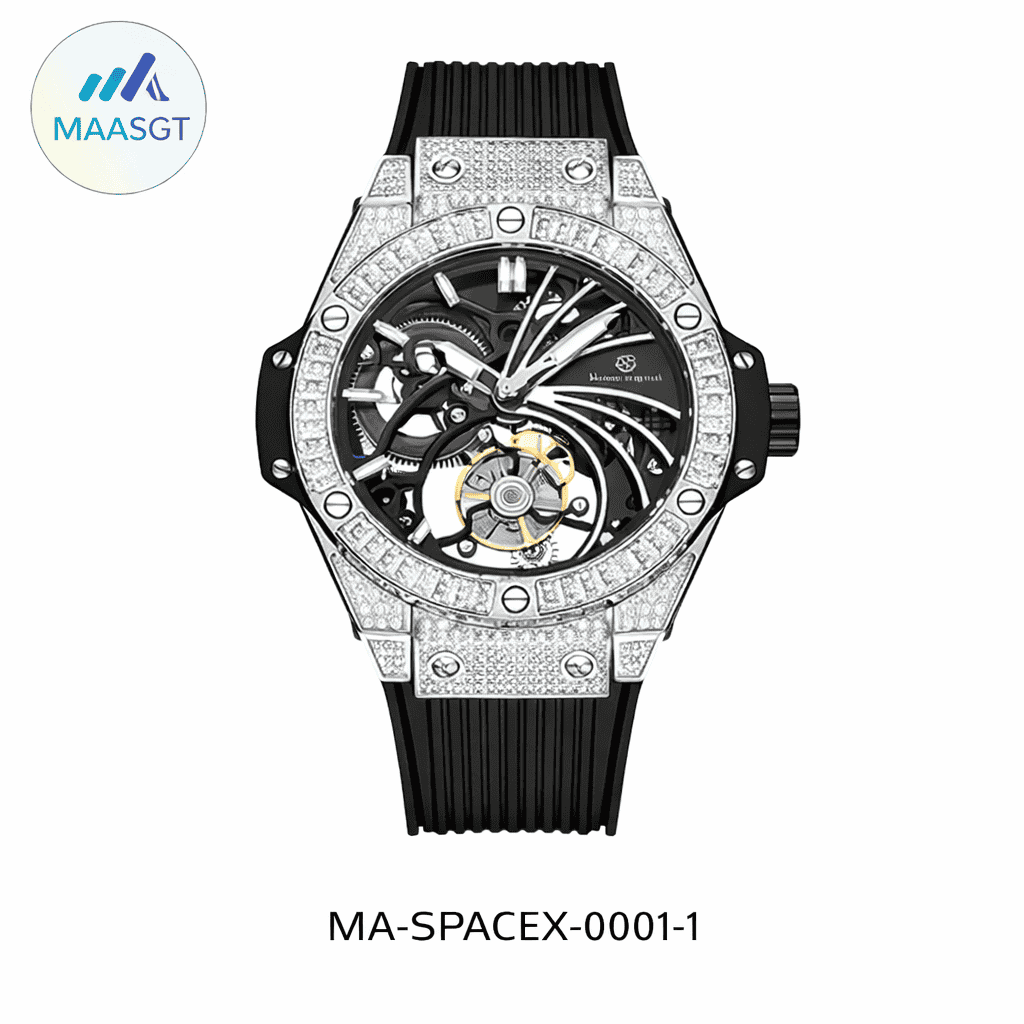 Luxury skeleton men’s watch MA-SPACEX-0001-1 featuring a 316L stainless steel case, zircon-set bezel, tourbillon manual-winding movement, hardened mineral glass, and durable silicone strap. Designed with a bold 48 mm dial, blue luminous details, and 3 ATM water resistance for statement wear.